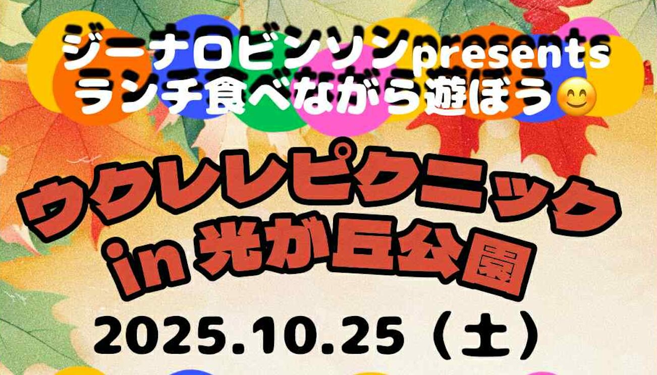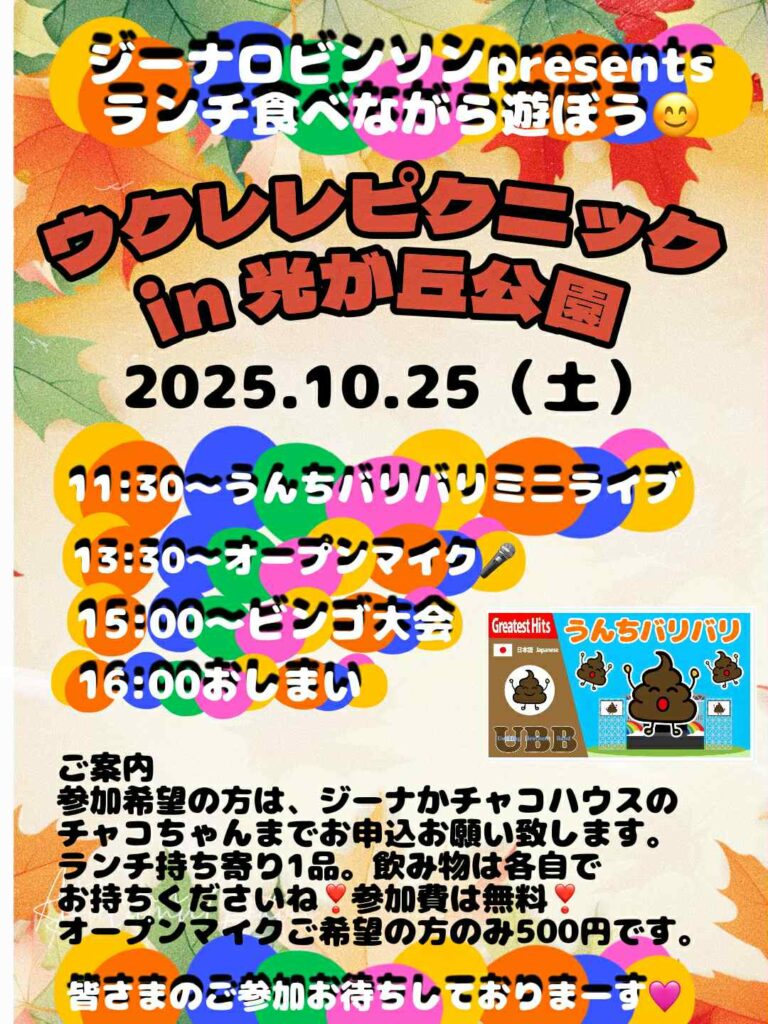 2025年10月25日(土)ウクレレでピクニック in 光が丘公園 スケジュール ジーナロビンソン presentsランチ食べながら遊ぼう 場所:練馬区 光が丘公園入場:無料時間:11:30〜うんちバリバリミニライブ